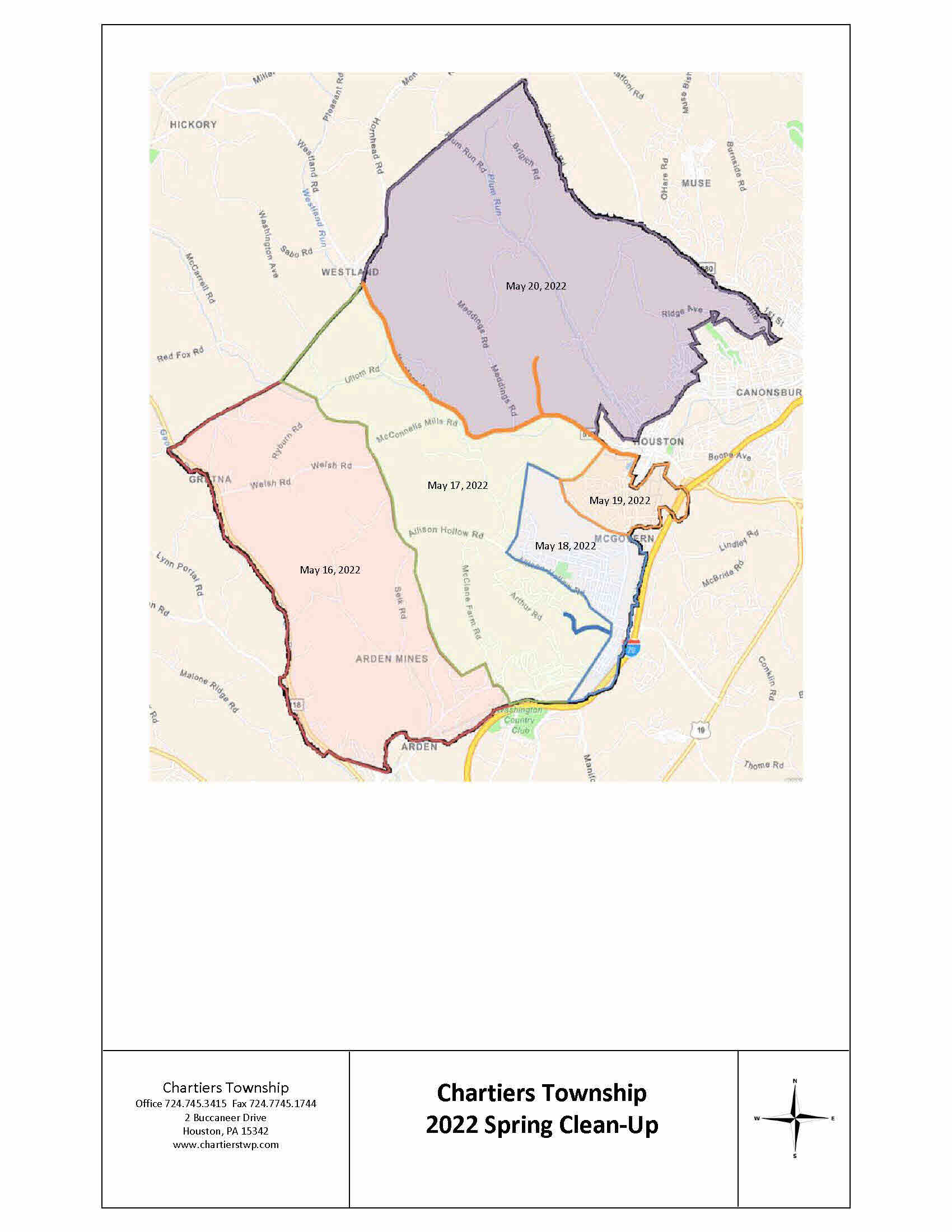 Spring Clean Up 2022 will be the week of May 16th -20th. Waste Management will basically start at the Western End of the Township and work their way East. The below Map will aid you in identifying your pick up day. Please consider having your items out to the curb at least the night before your scheduled pick up. They start collecting very early in the morning.